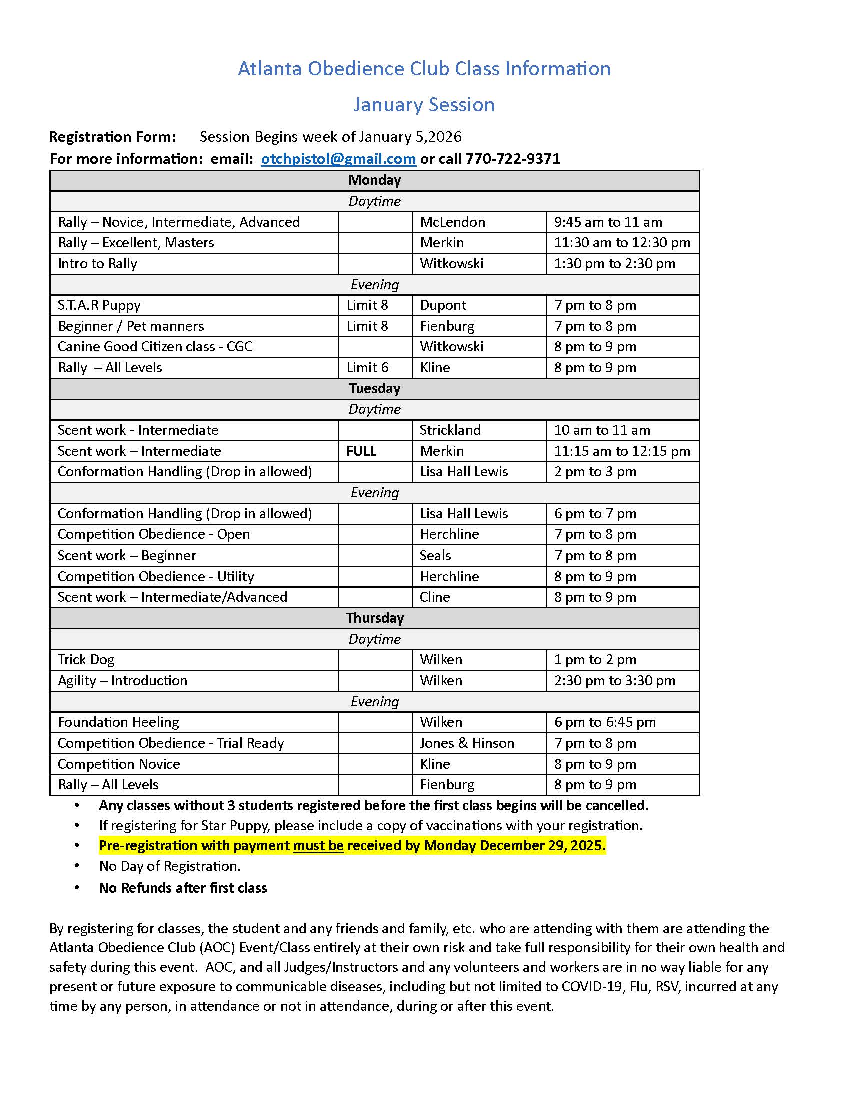- Any classes without 3 students registered before the first class begins will be cancelled.