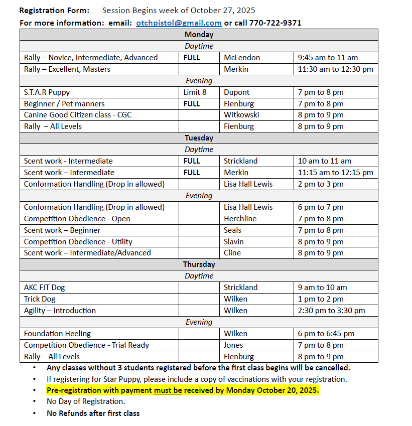 By registering for classes, the student and any friends and family, etc. who are attending with them are attending the Atlanta Obedience Club (AOC) Event/Class entirely at their own risk and take full responsibility for their own health and safety during this event. AOC, and all Judges/Instructors and any volunteers and workers are in no way liable for any present or future exposure to communicable diseases, including but not limited to COVID-19, Flu, RSV, incurred at any time by any person, in attendance or not in attendance, during or after this event.